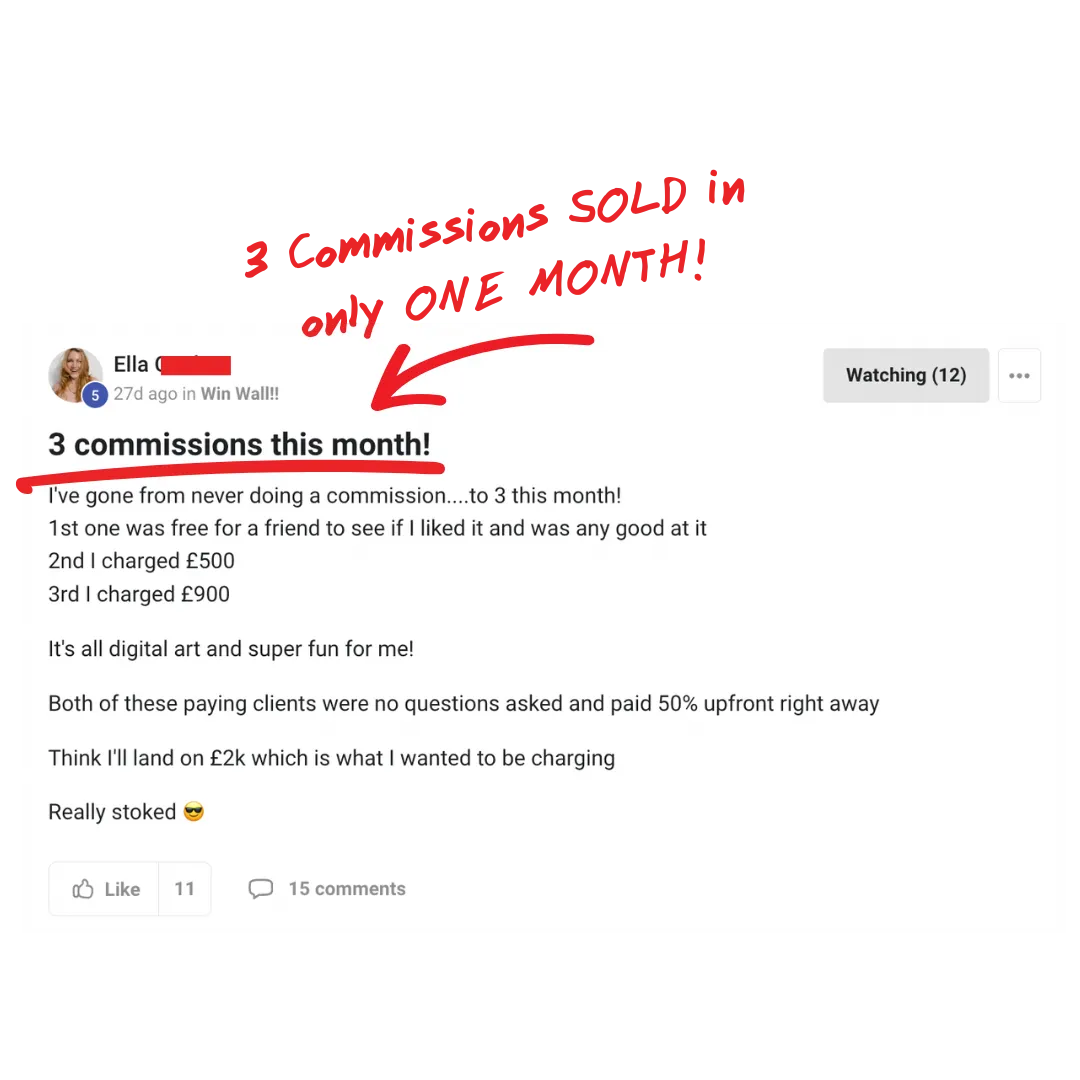 The system has been tested by thousands of artists, with proven results like $10,500 commissions, $3,000 sales from one social media post, and consistent monthly income ranging from $5k-$20k.